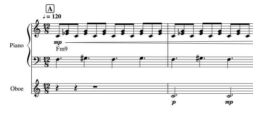 The contrast between the steady motion of the piano and the expressive line of the oboe creates a sense of dialogue, even though the overall mood remains introspective. Besides, contrast between piano and oboe creates a clear separation between rhythmic structure and melodic expression.