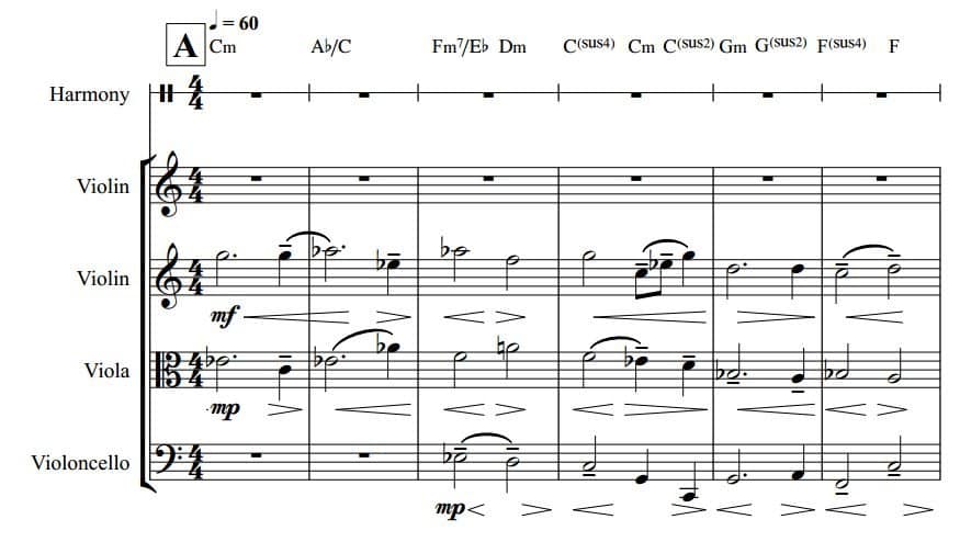 Articulation changes (like pizzicato in later sections of the score) are used carefully, not to add rhythm, but to slightly redefine the texture without breaking the stillness.