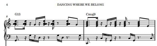 Dancing Where We Belong is a piece built on a simple but effective idea: a rhythmic-harmonic motif that captures a specific emotional moment.