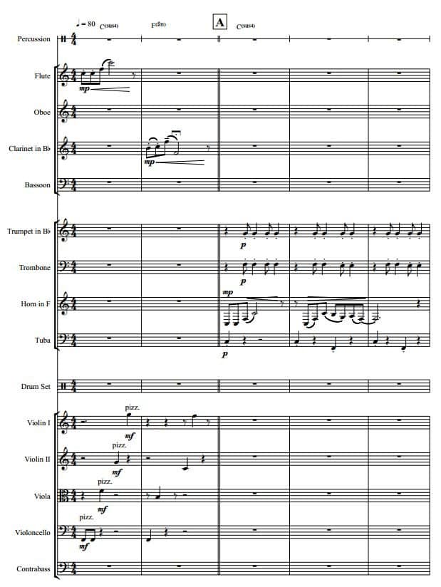 The opening already reflects this approach, with sparse entries and pizzicato strings supporting isolated melodic gestures.